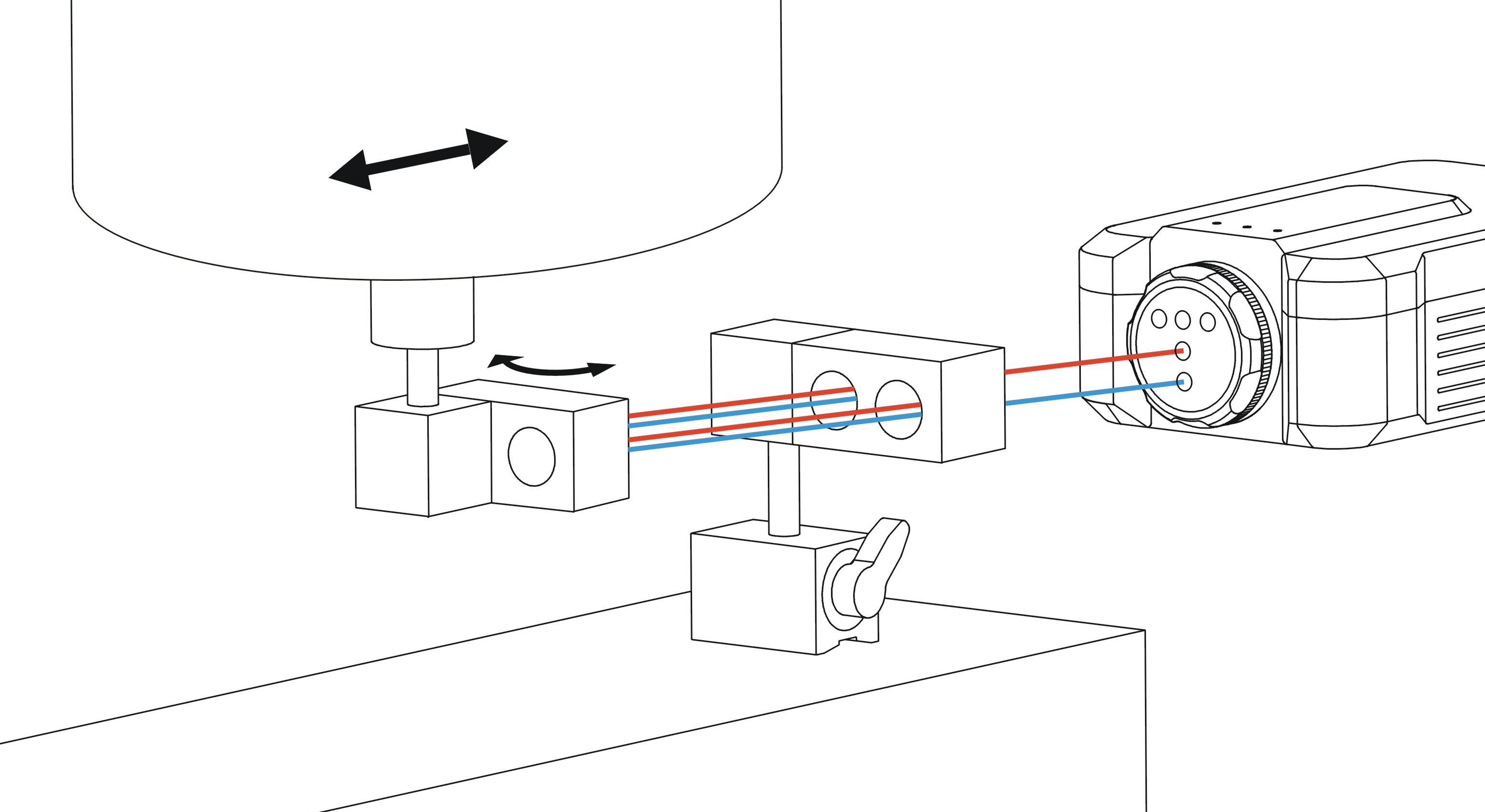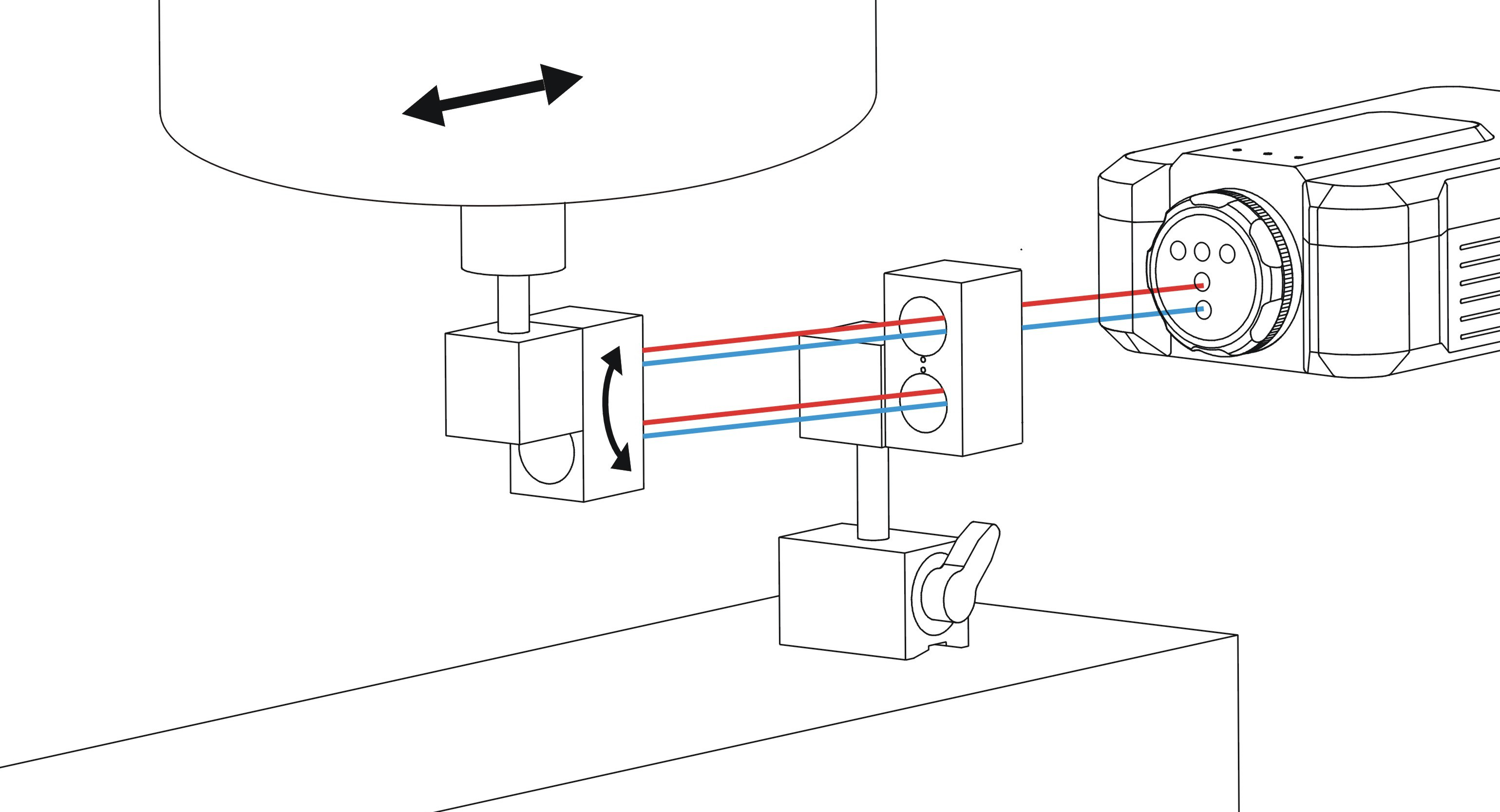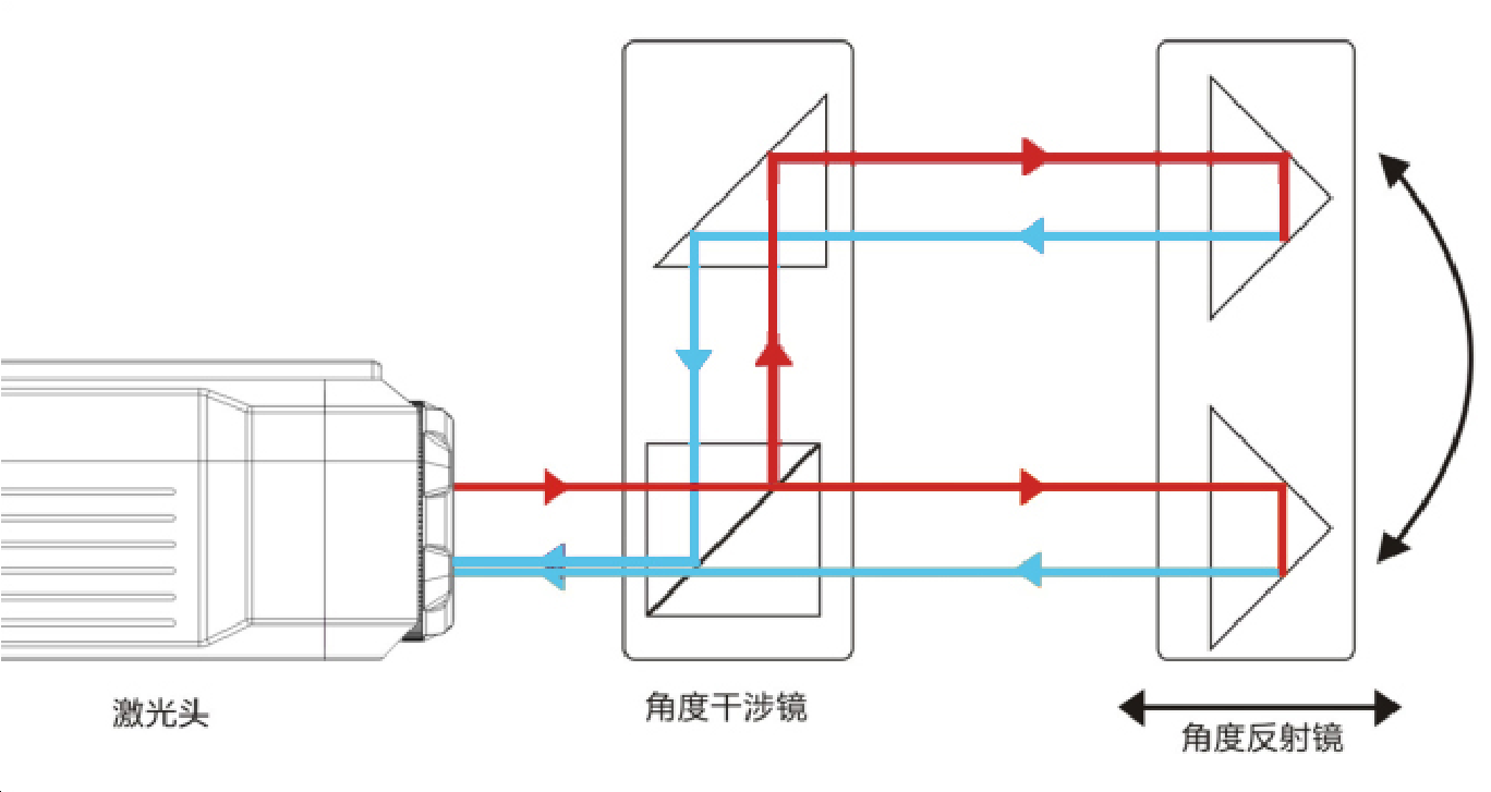 角度反射镜与待测的运动轴相连,角度干涉镜是静止安装。激光头射出一束光至角度干涉镜,其内部的分光镜将光束分成两部分,一部分直接通过干涉镜,并从角度反射镜的某一半反射回激光头(参考光束 A1)。另一条光束则通过角度干涉镜的角度分光镜,传到角度反射镜的另一半,角度反射镜使光束通过干涉镜返回到激光头(测量光束 A2)。当倾斜误差发生时,角度反射镜会有俯仰等运动,即角度反射镜会相对于固定的角度干涉镜发生小角度的旋转。这会导致两条光束的光程不一致,其差值即可获取角度误差的大小。