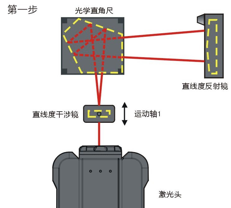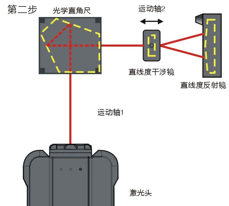 对于三根平移轴而言,其轴间误差即垂直度误差有三个:ξxy、ξxz和ξyz。激光干涉仪测量垂直度误差的根本原理是与直线度测量原理一致。它是通过一个共同的基准来测量两个垂直的轴的直线度从而实现垂直度的测量。这个共同的基准就是直线度反射镜,因此在整个测量过程中,它相对于工作台不可移动,不可调整,如下所示。图中的方块就是光学直角器,它用来保证在测量第一个轴时的激光光束完全垂直于第二个轴测量时的激光光束。