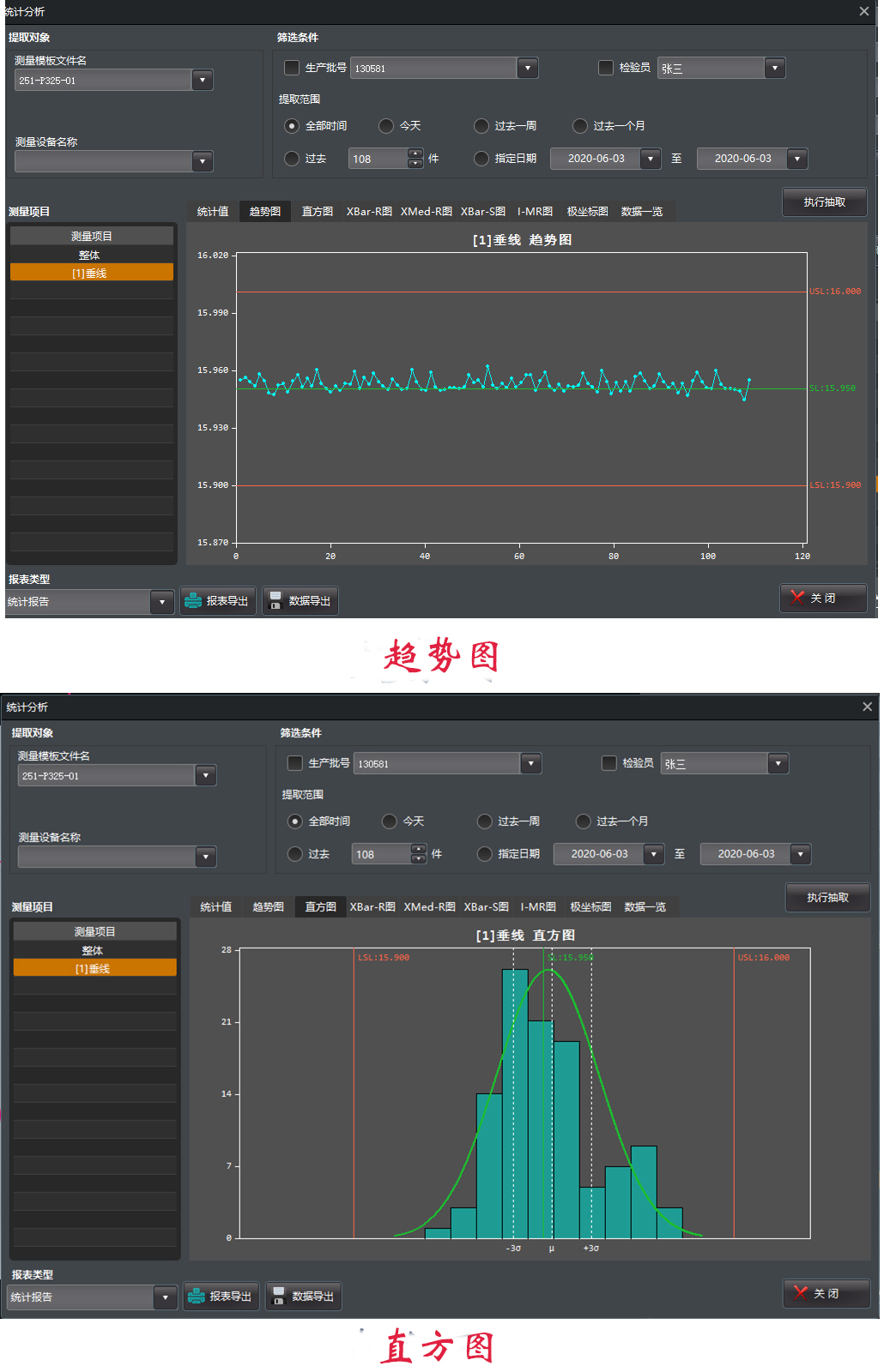 除常规的数据处理和查询功能外,系统还可自动生成趋势图、直方图和控制图等多种分析统计工具。