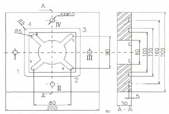 直线度值的测量选用 DRAGON1075 型手动三坐标测量机,测量点选择如图 3 所示,工件四边直线 (1,2,3,4) 和工件 对角线(5-7,6-8)。点心偏差的测量则选取Ⅰ点中心建立一个局部坐标系,再在Ⅱ点、Ⅲ点、Ⅳ点分别测量相对位置, 在加工测量前后注意比较理想坐标值和实际测量的坐标值, 验证试验工件的相关参数,如表 2 所示。
