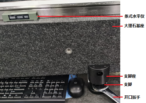 测长仪的水平调节一般保持1年/次,如下图所示放置水平仪在大理石台面,拆下支脚外壳,使用开口扳手调节到水平仪气泡左右对称不超过1格(分度为0.02mm/m每格);