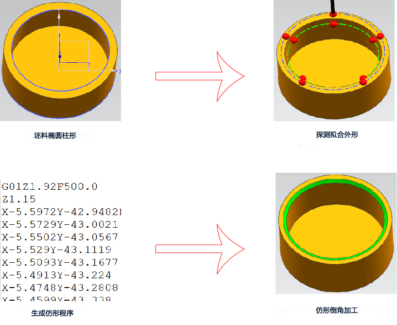 仿形加工流程:坯料→探测→拟合外形→生成仿形程序→倒角加工。通过引入机床测头进行仿形加工很好地解决了客户有机玻璃圆柱胚料高光倒角大小边的问题,加工效果如图3所示。