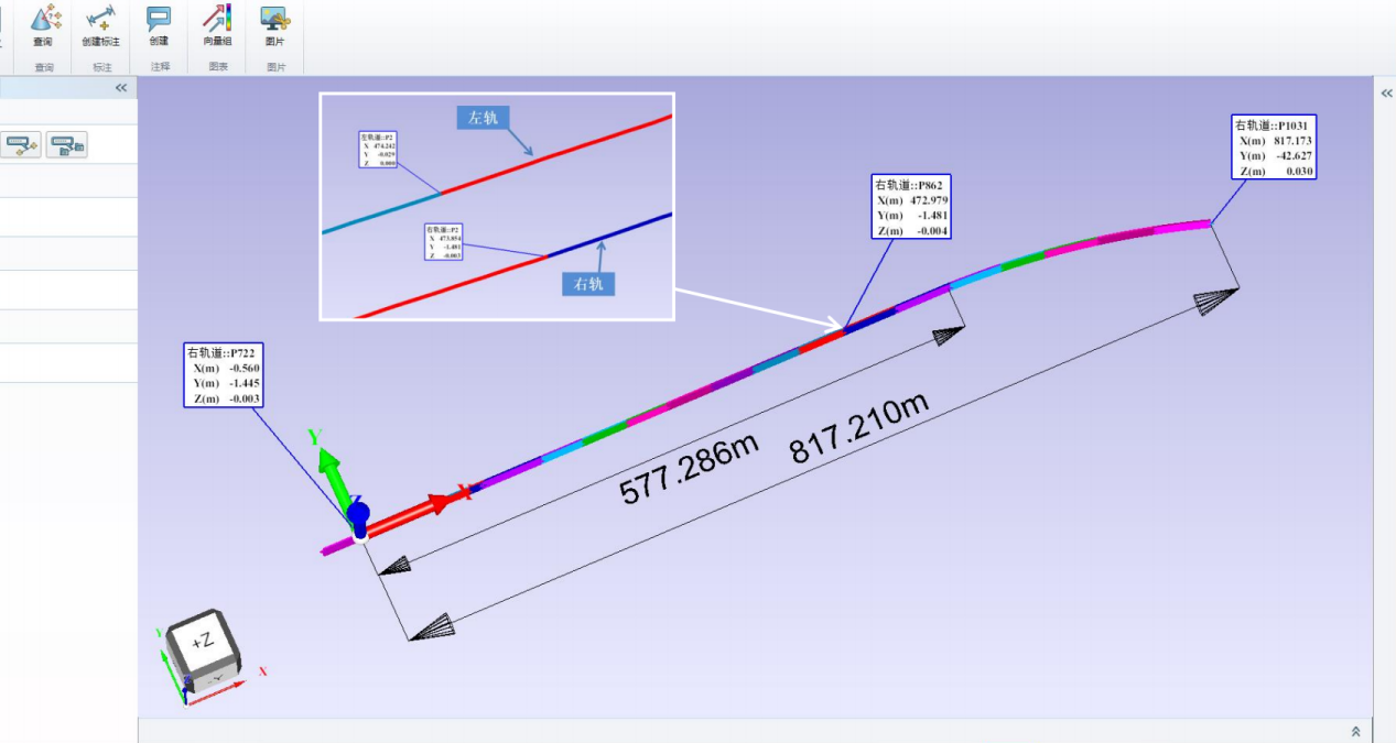 5. 经过多次的转站测量,全程800米的轨迹测量完成后。将测量数据导入到轨道几何分析工具中分析数据,完成轨道几何形位的测量。