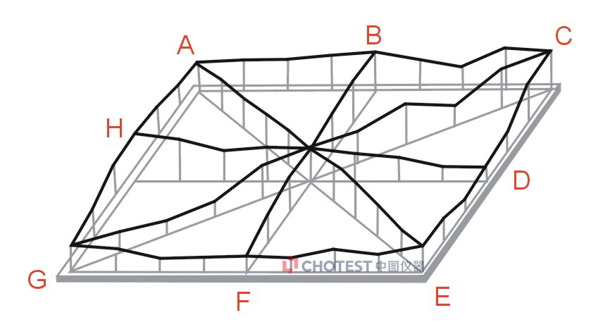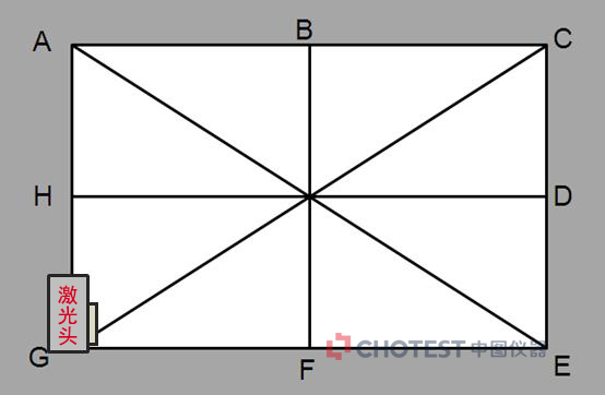 当需要测量一个平台的平面度时,需要先在平台上采集若干条测量直线,测量平面度的方法为:对角线测量法(又称为米字法),当激光头处于G点处时,光线射向E点时,参考使用EA、CA、DH、EG、AG、BF、CE、GC的顺序点进行测量。