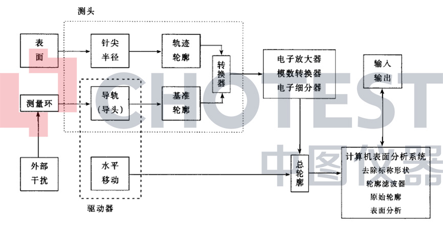 传感器相对被测工件表而作匀速滑行,传感器的触针感受到被测表而的几何变化,在X和Z方向分别采样,并转换成电信号,该电信号经放大和处理,再转换成数字信号储存在计算机系统的存储器中,计算机对原始表而轮廓进行数字滤波,分离掉表而粗糙度成分后再进行计算,测量结果为计算出的符介某种曲线的实际值及其离基准点的坐标,或放大的实际轮廓曲线,测量结果通过显示器输出,也可由打印机输出。