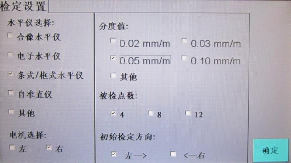 3)检定设置:点击“检定设置”键进入参数设置界面,选择“条/框式水平仪”,选择分度值“0.05mm/m”,选择被检点数“4”,选择检定方向从左至右,点击“确定”,如图4所示。
