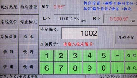 4)设置完毕进入检定界面,按照屏幕提示信息进行操作。首先通过屏幕下方数字键输入此次检定编号,如图5所示,然后点击“确定”,点击“清零”,再点击“开始检定”,设备即进入起始位置一侧分度值检定。