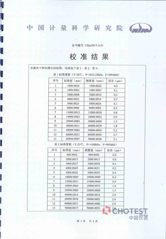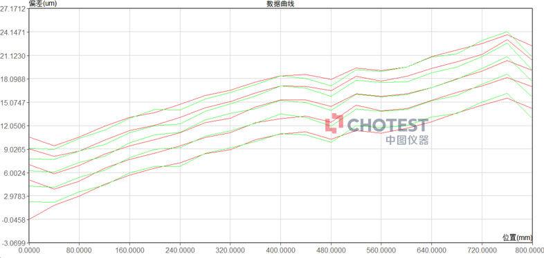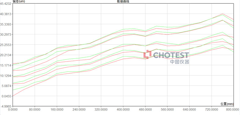 上图是中国计量科学研究院检测SJ6000激光干涉仪线性位移的数据,这表明SJ6000激光干涉仪在正确的安装手段、正确的环境补偿、稳定的测量环境下即使70米距离都能满足0.1Lum(L测量长度,单位:m)精度,远远超出设备的线性标称精度0.5Lum(L测量长度,单位:m)。