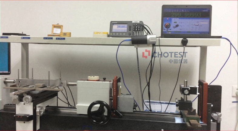 上图为在测长机上架设激光干涉仪用于检测量块的实际案例