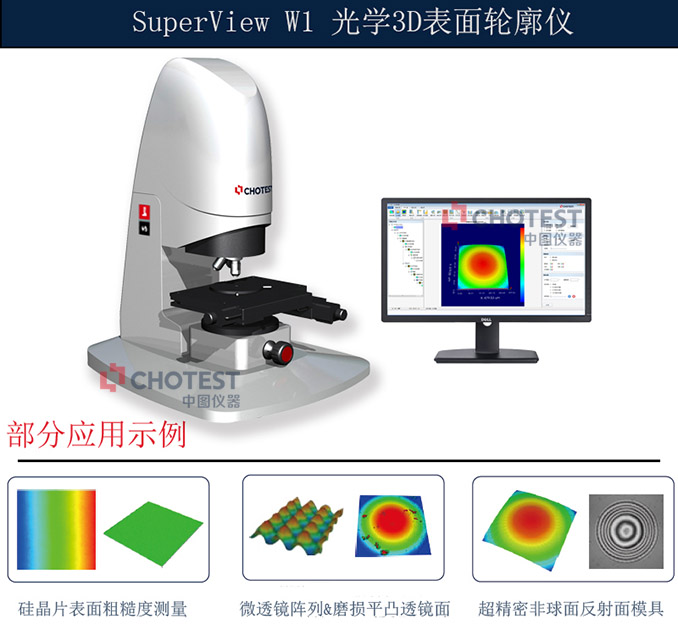 SuperView W1 光学3D表面轮廓仪采用光学非接触式测量方法,以白光干涉技术为原理,对硅晶片、微透镜阵列、磨损平凸镜面及棱镜平面等进行表面形貌特征测量和分析。