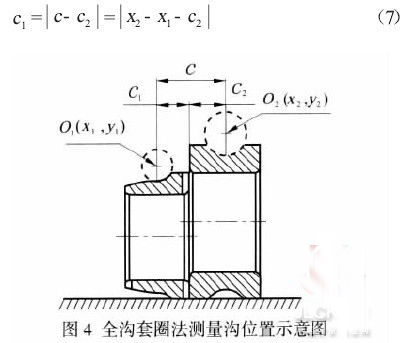此方法是用一个已知沟位置为c2的全沟套圈作为附件,得出待测套圈的沟位置。按照图4所示,将套圈安装好。由轮廓仪测量出两个套圈的沟道轮廓,借助测量分析软件,得到两套圈沟道曲率中心在x轴方向坐标x1、x2,则两套圈沟道的圆心距离为: