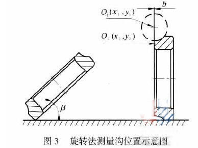 此方法不需要用钢球和滚子作为测量附件。测量时,按图3所示,先将被测套圈倾斜β度角,由轮廓仪测量出套圈沟道及端面母线的轮廓。借助测量分析软件,将测量出的轮廓线旋转到垂直状态,得到钢球的圆心o1与沟道的圆心o2在x方向坐标x1、x2,则被测套圈滚道沟位置应为: