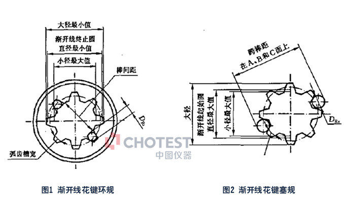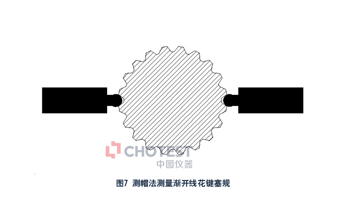 中图蘑菇视频 SJ5100高精度光栅测长机对渐开线花键塞规的测量使用的是测帽法,如下图7-测帽法测量渐开线花键塞规。