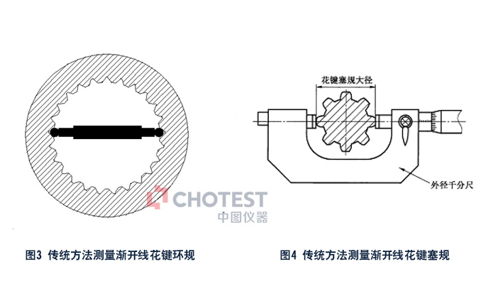 传统测量渐开线花键环规的棒间距主要采用针规加内径千分尺测量,操作时需手放置针规,旋转内径千分尺找到最小值,如下图3,传统测量渐开线花键塞规的跨棒距主要采用量棒加外径千分尺,操作时需旋转外径千分尺找到最大值,如下图4: