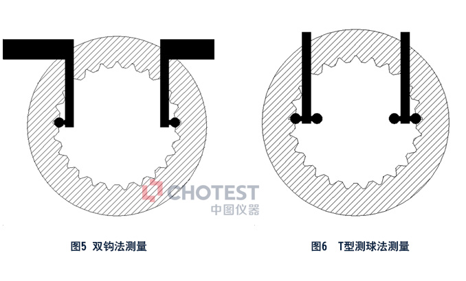 中图蘑菇视频 SJ5100高精度光栅测长机对渐开线花键环规的测量使用的是双钩法和T型测球法,如下图5-双钩法测量渐开线花键环规,图6-T型测球法测量渐开线花键环规(针对内径较小的内花键测量)。