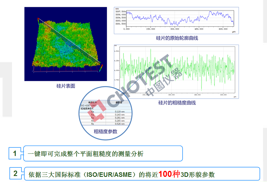 中图蘑菇视频 SuperView W1 系列光学3D表面轮廓仪可对硅晶片平面度、粗糙度、波纹度、面形轮廓、表面缺陷、磨损情况、弯曲变形情况、加工情况等表面形貌特征进行测量和分析。