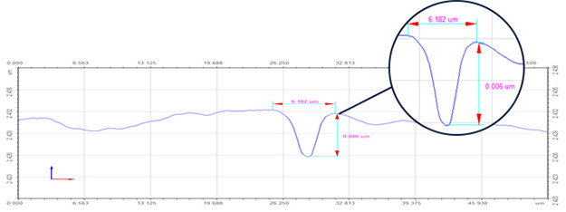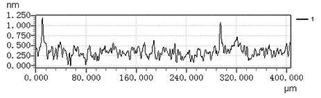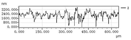 如上图所示,光面的粗糙度曲线显示,光面上分布的凸点只有1nm左右的高度起伏,其表面粗糙度为0.1nm左右,而糙面的高度起伏则达到了3.2um,表面粗糙度则为500nm左右。