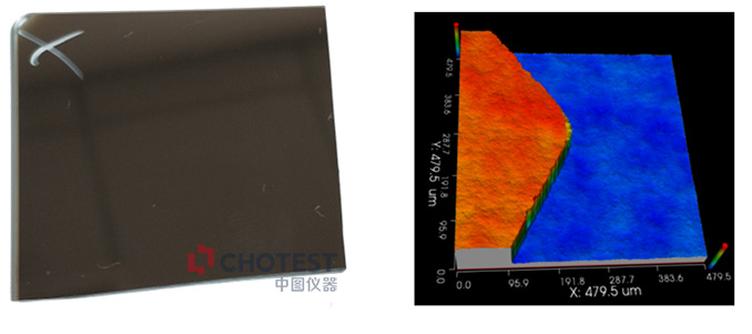 下图为透明玻璃表面镀的一层金属膜,需要测膜层的厚度,由于其非透明的特性,薄膜测厚仪无法进行测量,而由于其膜层厚度精度在纳米级别,接触式的台阶仪和其它的非接触式光学蘑菇视频 也存在测量误差较大的风险,而以光学干涉原理为基础研制成的中图蘑菇视频 光学3D表面轮廓仪,以其亚纳米级别的测量精度,则可对该膜层厚度进行精确测量。