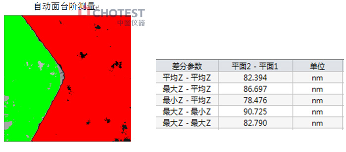 上图是利用软件的自动面台阶高检测功能对重建的3D图像两台阶高进行检测,从数值可知,两台阶面平均高度差为82nm,而最大高度差90nm,最小高度差为78nm。