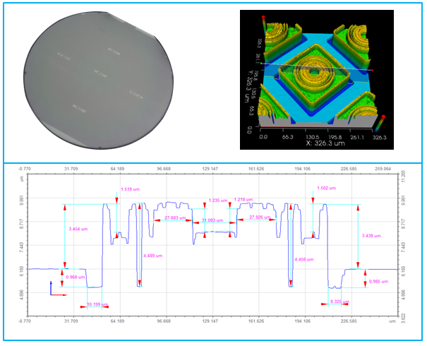晶圆IC的制造过程可简单看作是将光罩上的电路图通过UV蚀刻到镀膜和感光层后的硅晶圆上这一过程,其中由于光罩中电路结构尺寸极小,任何微小的粘附异物和瑕疵均会导致制造的晶圆IC表面存在缺陷,因此必须对光罩和晶圆IC的表面轮廓进行检测。下图是一块蚀刻后的晶圆IC,使用光学3D表面轮廓仪对其中一个微结构扫描还原3D图像,并测量其轮廓尺寸。