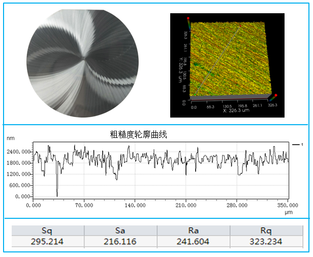 从上图可以看出,粗磨后的表面存在明显的磨削纹路,而3D图像显示在左下部分存在一处凹坑瑕疵,沿垂直纹理方向提取剖面轮廓并经过该瑕疵,在剖面轮廓曲线里可看到该处瑕疵最大起伏在2.4um左右,而磨削纹理起伏最大在1um范围内波动,并获取该区域的面粗糙度Sa为216nm,剖面线的粗糙度Ra为241nm。
