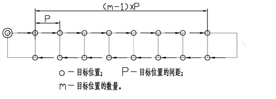 行程至2000mm时,在全长范围内,每间隔100mm左右选一目标位置,沿每个目标位置正、负方向各循环五次;其轴线双向定位精度数值A按GB/T17421.2规定执行。