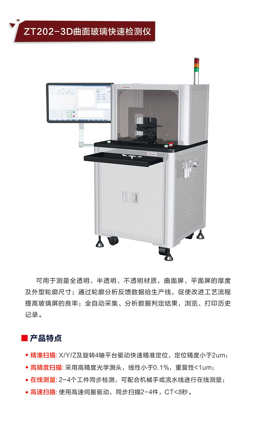 ZT202-3D曲面玻璃快速检测仪专用于测量全透明、半透明、非透明材质,曲面屏、平面屏的厚度及外形轮廓尺寸,并实时将测量结果以图表的形式反馈给用户,用户对生产加工的精度了如指掌,可大幅优化工艺流程和提高良品率。