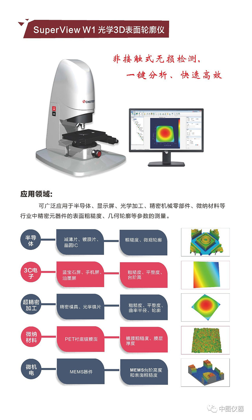 SuperView W1光学3D表面轮廓仪专用于半导体、显示屏、光学加工、精密机械零部件、微纳材料等行业中精密元器件的表面粗糙度、几何轮廓等参数的测量,精度达到纳米级。